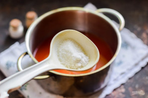 Всыпьте порцию сахарного песка и соли, проварите томат 20 минут. Если у вас нет хорошей соковыжималки, которая дает чистый сок, без косточек и кожуры, значит обязательно томат, перед варкой, протрите через сито.
