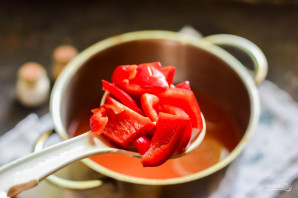 Спустя указанное время варки добавьте в кастрюлю красный сладкий перец нарезанный крупными кусками.
