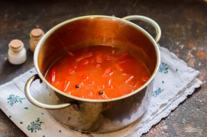 Варите перец 40 минут на небольшом огне, масса не должна бурлить, а лишь слегка кипеть. В конце приготовления добавьте уксус.