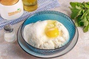 Выложите творог в глубокую емкость, всыпьте сахар, соль и вбейте куриное яйцо. Тщательно все перемешайте.