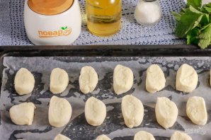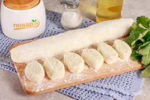 Разделите тесто на две части и сформируйте из каждой из них небольшую колбаску. Обязательно подпылите рабочую поверхность мукой, чтобы тесто к ней не прилипало. Нарежьте колбаски на одинаковые кусочки.