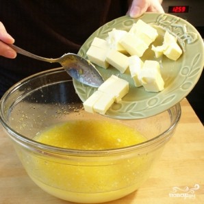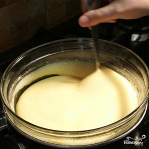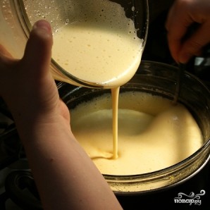 Как только масло растопится, добавляем в кастрюлю, не снимая ее с водяной бани, взбитые яйца.