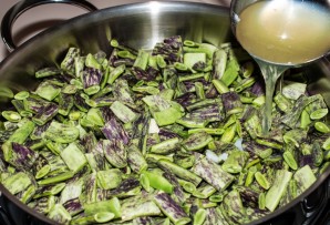 Промойте, порежьте на средние кусочки фасоль. Залейте бульоном.
