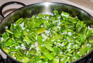 Мелко порежьте лук и добавьте его в фасоль. Тушим на маленьком огне минут 30 с закрытой крышкой.