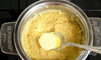 Как каша загустеет, добавьте в неё масло. Постоянно мешая, варите ингредиенты 15 минут.