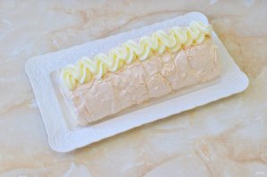 Обрежьте рулет по бокам, чтобы сделать его ровным. Украсьте отложенным кремом. Поставьте в холодильник, чтобы он пропитался и крем немного застыл.