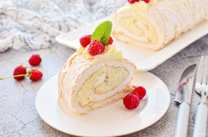 Для начинки в меренговый рулет подходит заварной крем, крем-чиз или взбитые сливки. Любой из этих кремов можно сделать шоколадным. В качестве ягодного наполнения подойдет малина, клубника, голубика