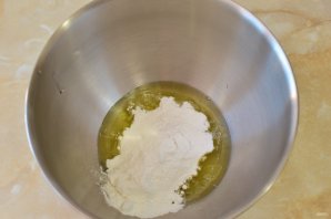 Когда масса станет пышной и густой, вмешайте крахмал и сок лимона.