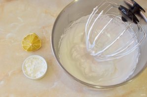 Пока крем остывает, займитесь приготовлением меренги. Отделите белки от желтков. Это, примерно, 6 яиц. Смешайте с сахарной пудрой и включите минимальную скорость миксера. Постепенно её увеличивайте.