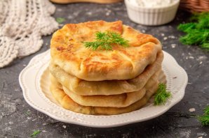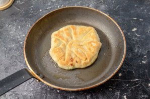 Края теста сложите в квадратный конверт, швы хорошо защипните. Прижмите лепешку руками, чтобы края получше соединились и начинка хорошо разошлась внутри пирога.