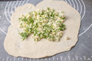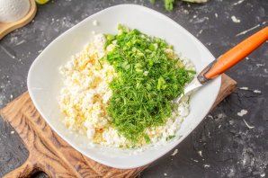 Добавьте мелко нарезанные укроп и зеленый лук. Перемешайте начинку.