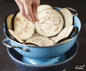 1. Баклажаны вымойте, нарежьте кружочками и щедро посолите. Оставьте на некоторое время, а затем как следует промойте под проточной водой, чтобы ушла лишняя горечь.