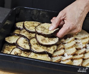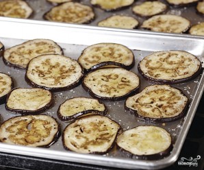 2. Добавьте немного специй по вкусу, выложите обсушенные кружочки баклажанов на противень, сбрызните оливковым маслом и отправьте в разогретую духовку. Запекайте их до румяности около получаса.