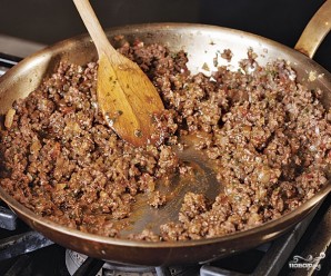 3. Для приготовления мясной начинки обжарьте в небольшом количестве оливкового масла мелко нарезанный лук. Добавьте фарш и жарьте, помешивая. Посолите, поперчите, добавьте красное вино, мускатный орех и немного томатной пасты. Все как следует перемешайте и тушите на среднем огне до готовности.