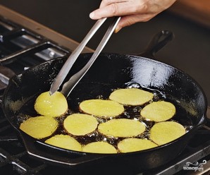 4. Картофель вымойте, очистите (молодой можно оставить в кожуре) и обсушите. Нарежьте тонкими ломтиками. Разогрейте на сковороде оливковое масло и обжарьте на сильном огне картофель до румяности с двух сторон. Также можно в рецепт приготовления мусаки использовать картофельное пюре.