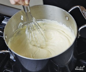 5. Последний подготовительный этап — это соус. Для его приготовления в сотейнике доведите до кипения молоко. Отдельно на сковороде растопите сливочное масло. Всыпьте муку и тщательно перемешайте, чтобы не было комочков. Когда мука станет золотистой, переложите ее в молоко. Добавьте соль, перец, мускатный орех и снимите с огня. Остудите немного, а после добавьте взбитые яйца и тертый сыр. Продолжайте взбивать, пока соус не станет полностью однородным.