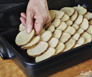 6. Жаропрочную форму смажьте маслом. Выложите на дно кружочки обжаренного картофеля.