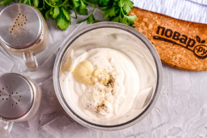 Выложите сметану любой жирности и майонез в чашу блендера, посолите и поперчите.