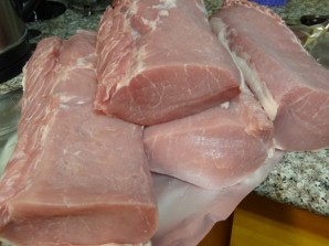 Свиную вырезку порежьте на большие куски, длиной по 15-20 см.