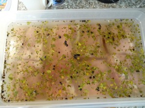 Смешайте пол-литра воды, чёрный перец, горчицу, ягоды можжевельника, кориандр, гвоздику, лавровый лист, перец чили и доведите до кипения. Затем охладите, смешайте с остальной водой, добавьте соль и сахар. В получившийся маринад опустите мясо, придавите грузом и поставьте в холодильник на 7 суток.