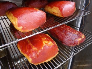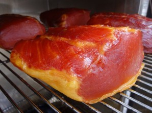 Подготовленное таким образом мясо коптите в коптильне холодного копчения на ольховых опилках. Коптить 12 часов при температуре не более 30 градусов. Прокопчённое мясо снова разложите на сетку и вяльте еще 3 суток.