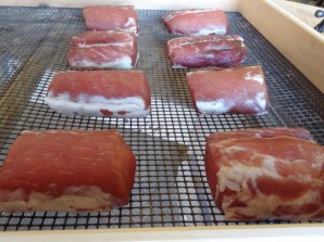 После этого разложите мясо на сетке и оставьте в проветриваемом помещении вялиться в течение 24 часов.