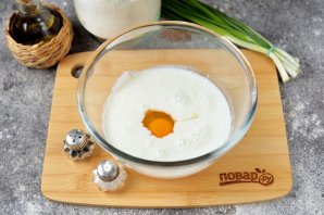 В глубокой миске взбейте кефир с низким процентом жирности и куриное яйцо до однородного состояния.