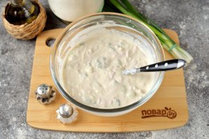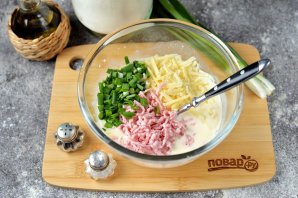Натрите на крупной терке твердый сыр и вареную колбасу, нарежьте мелко зеленый лук. Переложите все эти ингредиенты в миску, аккуратно все перемешайте.