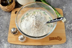 Всыпьте муку, разрыхлитель, соль и перец по вкусу, также добавьте немного сахара.