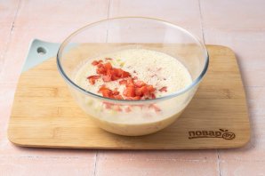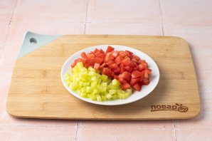 Нарежьте на мелкие кубики помидор и болгарский перец.