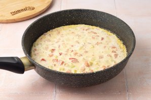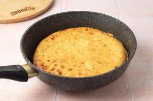 Сковороду разогрейте на среднем огне и смажьте растительным маслом. Распределите смесь тонким слоем. Толщину лучше не делать больше 1 см. Обжарьте омлет с одной стороны на средне-низкой температуре до золотистого цвета.