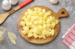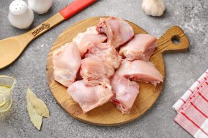 Курицу промойте, обсушите и порубите на порционные кусочки. Кожу я снимаю, но можете оставить. Если у вас куриное филе, то просто нарежьте его кусочками, но не слишком мелко.