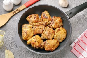 Натрите курицу солью и специями по вкусу. Оставьте на 30 минут мариноваться, а затем обжарьте на сильном огне в хорошо разогретой сковороде с маслом с двух сторон до появления лёгкой румяной корочки.