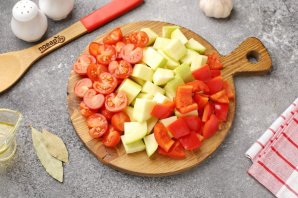 Кабачок нарежьте кубиками, но не слишком мелко, перец так же нарежьте кубиками или порубите брусочками. Помидоры нарежьте дольками, у меня черри, я просто разрезала их пополам.