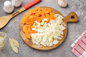 Лук и морковь нарежьте произвольно, но не слишком мелко. Чеснок нарежьте пластинами.