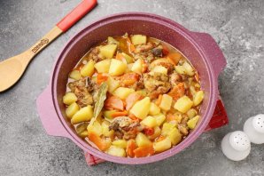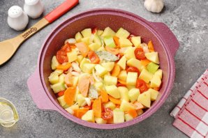 Соедините овощи, посолите, поперчите, добавьте 1,5-2 ст.л. растительного масла, лавровый лист, перемешайте и выложите в жаропрочную форму.