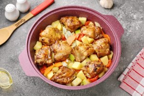 Добавьте примерно половину стакана воды, а сверху выложите обжаренные кусочки курицы. Накройте форму фольгой и запекайте в разогретой до 180 градусов духовке 1 час. После чего, не убирая фольги, дайте блюду постоять ещё 30 минут.