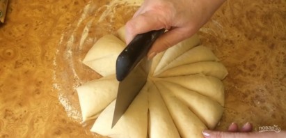 3. Тесто округлите, переложите в смазанную растительным маслом миску и накройте пленкой. Оставьте при комнатной температуре на 3-5 часов. Выложите тесто на присыпанный стол, округлите и разделите на 16 частей.
