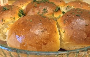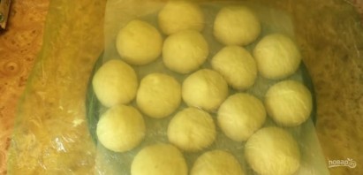 4. Каждый кусочек округлите и выложите в покрытую пергаментом форму. Накройте пампушки и оставьте на 1 час. Смажьте пампушки слегка взбитым яйцом и отправьте в разогретую до 180 градусов духовку на 30 минут.
