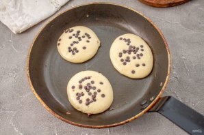 Предложу несколько идей для вкусной начинки. Можно посыпать тесто черникой или другими ягодами, хрустящим поджаренным беконом или панчеттой, бананом или тертым шоколадом. Я использовала шоколадные капли и ягоды. Жарить как панкейки без начинки.