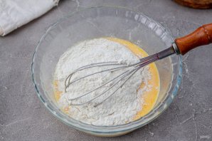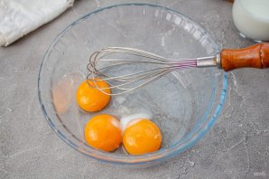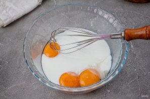 Влейте молоко комнатной температуры, перемешайте венчиком с желтками.