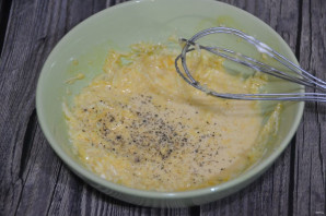 Сливочно-сырную смесь с желтками поперчите, перемешайте.