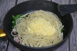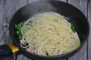 Отваренные спагетти выложите в сковороду к обжаренной грудинке.