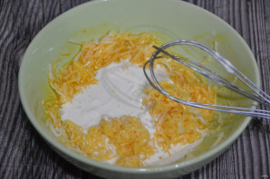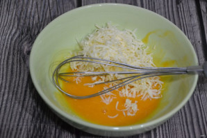 К желткам добавьте тертый сыр.