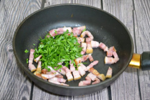 Зелень петрушки измельчите и добавьте к обжаренной грудинке.