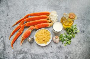 Подготовьте все необходимые ингредиенты для приготовления пасты с крабом в сливочном соусе. У меня замороженные клешни краба стригуна, их необходимо разморозить на нижней полке холодильника.