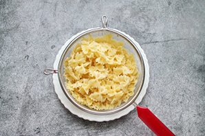 В кастрюлю налейте воду, посолите и доведите до кипения на среднем огне. Выложите пасту и варите до состояния аль денте. Откиньте пасту на сито и дайте отвару полностью стечь.