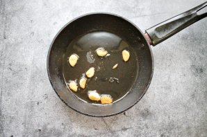 В сковороду налейте растительное масло и разогрейте на среднем огне. Дольки чеснока очистите, разрежьте пополам и выложите в масло. Обжаривайте их до золотистого цвета и удалите.