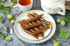 Блюдо готовится без лишних сложностей. Пастила получается довольно кислой, но это зависит от сорта и степени зрелости крыжовника. Если предпочитаете более сладкий вариант, добавьте немного сахара или мед. Пюре из крыжовника можно перетереть через мелкое сито, тогда пастила получится более гладкой. Если нет специальных поддонов для пастилы, вырежьте форму из пергамента и обязательно смажьте растительным маслом, иначе не сможете снять пастилу. При отсутствии электросушилки, пастилу можно приготовить в обычной духовке на противне, застеленным смазанным пергаментом Готовый десерт можно подавать к столу.