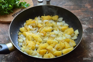 В сковороде прогрейте растительное масло, выложите лук и тыкву. Жарьте 8-9 минут на небольшом огне.